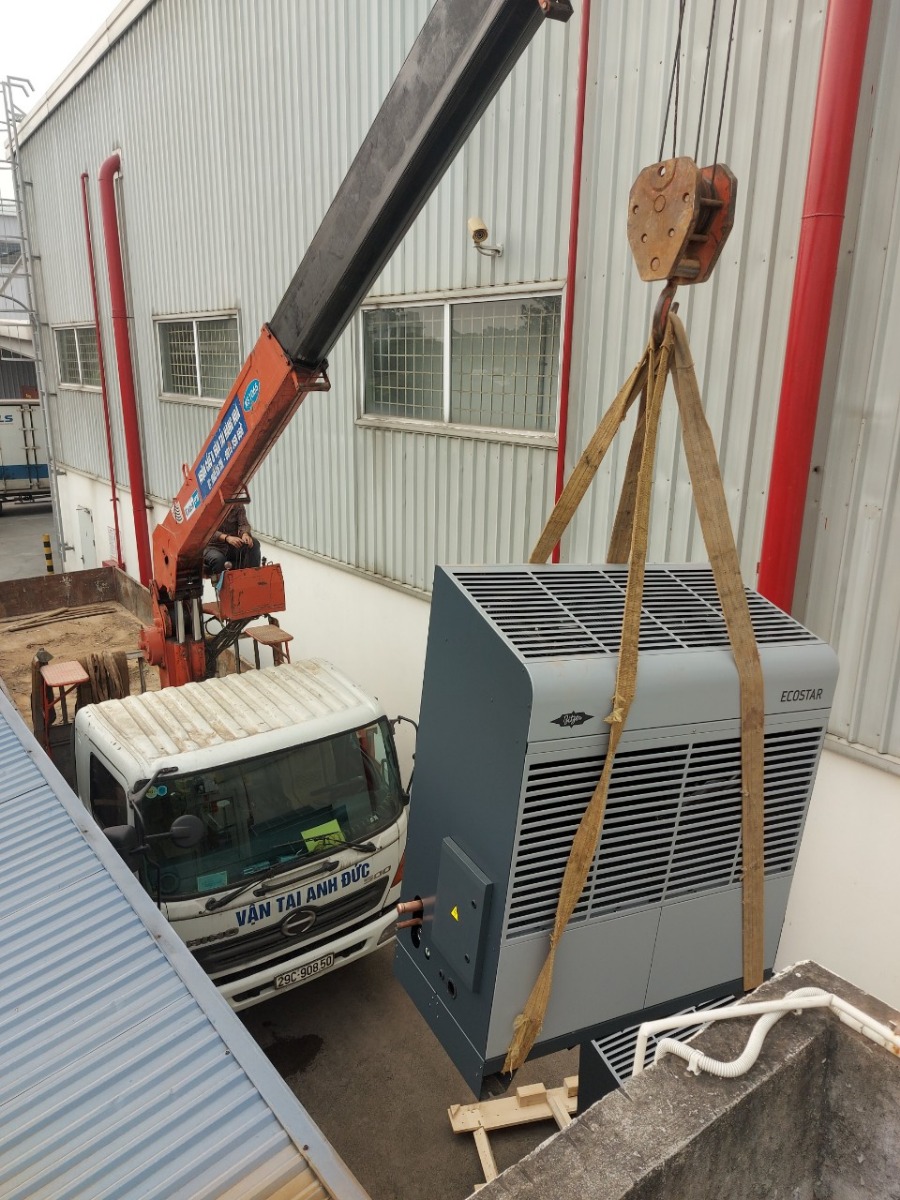 Cẩu Cụm máy nén dàn ngưng và treo thiết bị dàn lạnh Guntner lên vị trí lắp đặt